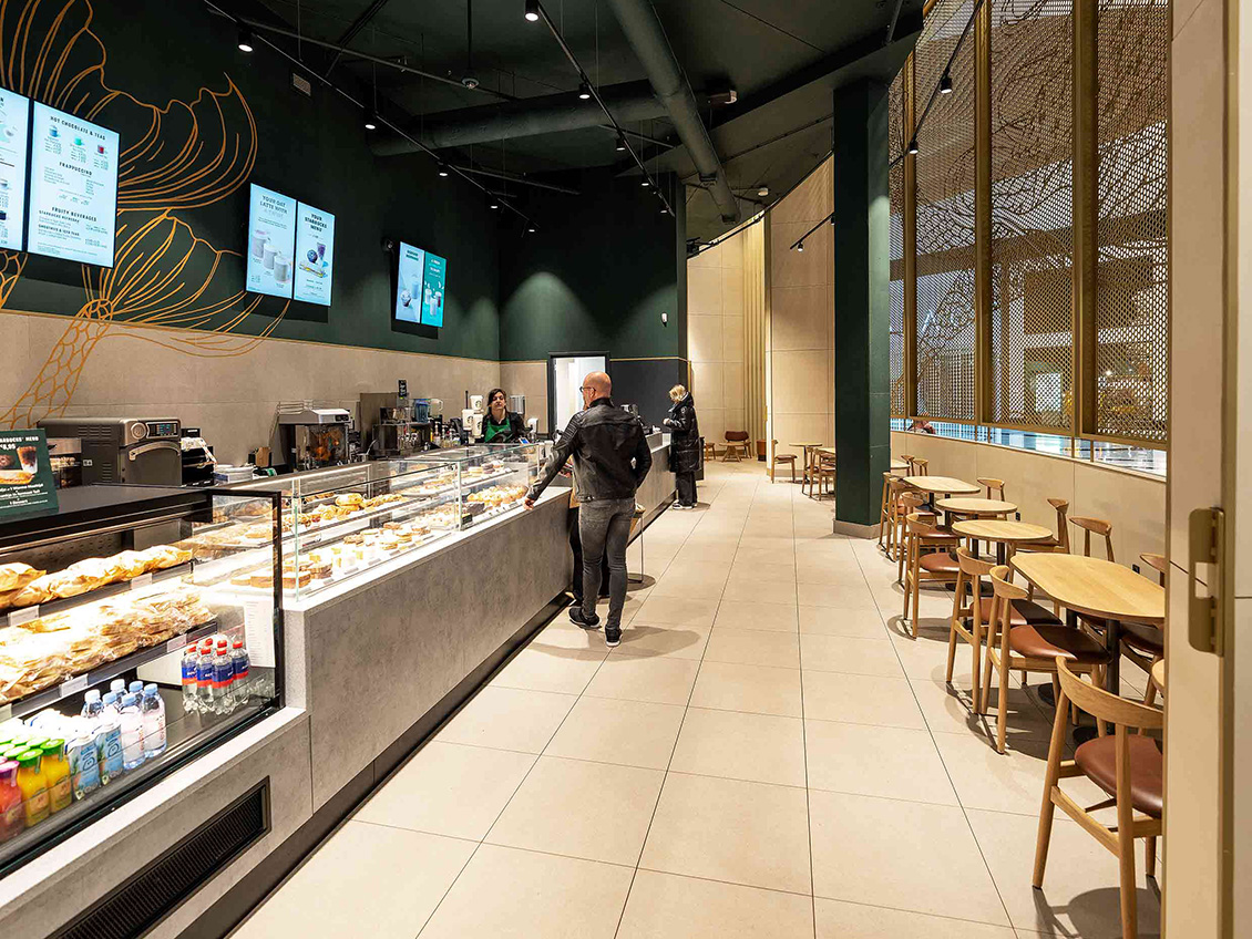 Westfield Mall of the Netherlands, and this Starbucks, benchmark an ambitious BREEAM sustainability certification through choice of building materials and -process, through extensive recycling practices, smart lighting systems, the use of 100% renewable energy and underground thermal energy storage.